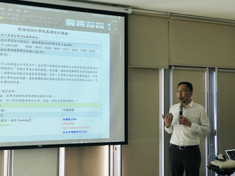本課程將以「穿戴式裝置之專利發展」為主題,讓跨領域團隊找出專利發展的蛛絲馬跡,對看得到、摸得到的穿戴式裝置有更深認識。同時,引導學生進行全球專利檢索,希望同學們修習此課程期間能實際的建立專利技術地圖,適當發揮創意把穿戴式裝置和未來生活想像結合起來,掌握趨勢看見有潛力的專利說明書。